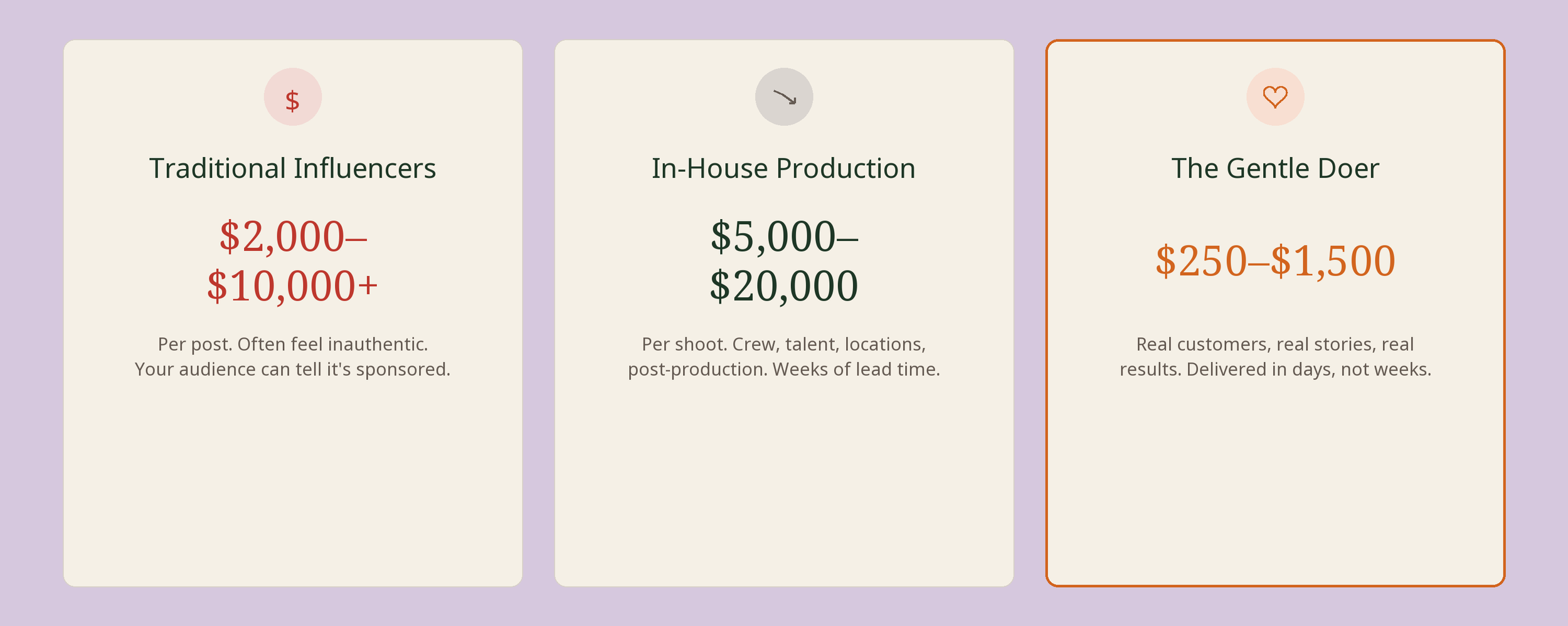 User-generated content gets 4x higher click-through rates than brand-created content. Testimonial videos convert 3x better than product demos. And the cost? A fraction of what you'd pay an influencer or production house.